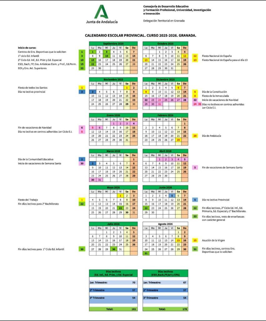 Además, os dejamos adjunto el calendario escolar oficial, donde podréis consultar las fechas clave del curso: inicio y fin de clases, festivos y periodos vacacionales.